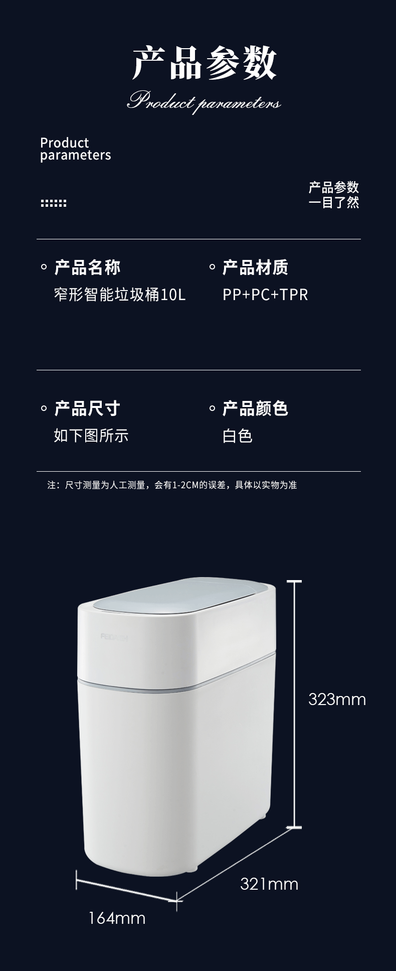 品牌名稱(chēng):飛達三和 生產(chǎn)地區:中國·浙江·臺州 產(chǎn)品貨號:TG6100 裝箱數:1 產(chǎn)品尺寸:32.3x16.4x31.8cm 外箱尺寸:33.5x17.5x33.5cm 條形碼:6931643824934 飛達三和TG6100 窄形智能垃圾桶 10L